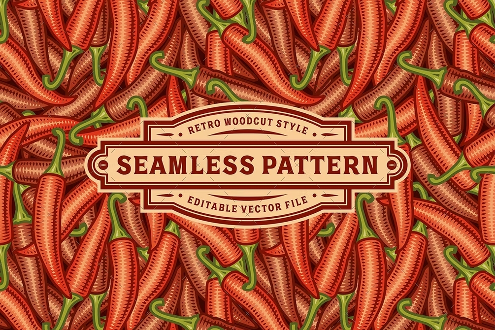 Seamless chili pepper pattern in woodcut style. Editable vector illustration with clipping mask.