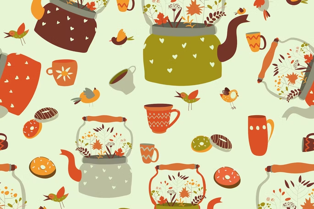 Vector seamless pattern background with tea related symbols.